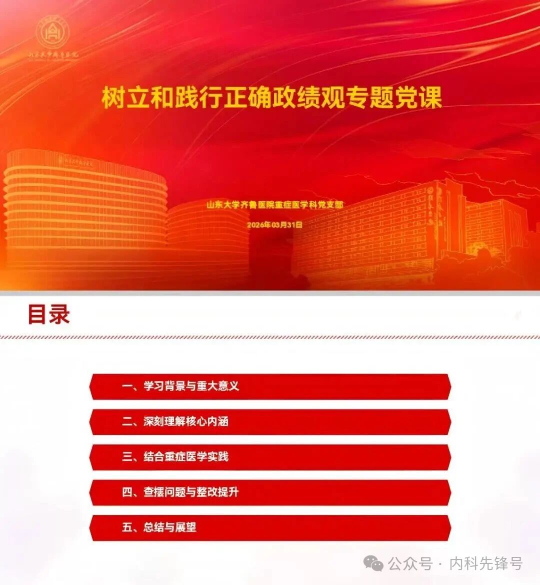 此次党课学习与交流研讨实现了学思用贯通、知信行统一,将正确政绩观要求与科室高质量发展深度融合,切实把学习成果转化为政治能力、履职成效与为民实绩。下一步,重症医学科党支部将按计划压茬推进、逐项落实,持续深化理论学习、强化实践转化、健全长效机制,引导全体党员以正确政绩观引领履职尽责,在守护生命一线彰显医者担当、贡献重症力量。