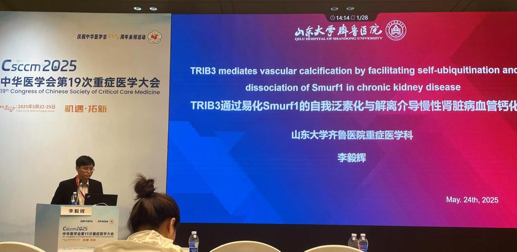 重症医学科主任王昊教授受邀担任大会学术论坛主持人并作专题报告,他围绕《如何挖掘重症科研中的“第一桶金”》《脓毒症时器官间串扰的机制-肠道菌群》作专题发言,并深入剖析探讨《ICU的急性意识障碍的诊断,干预与预后》,其前沿观点为重症医学青年科研工作者提供了新思路,引发广泛讨论。李琛教授主持学术会议并作专题报告《ECMO的氧疗目标》,报告基于详实文献,系统阐述了ECMO治疗期间最佳氧疗目标的确定策略,对临床实践具有重要指导价值。李毅辉副主任医师分享了最新的学术成果《TRIB3 mediates vascular calcification through facilitating self-ubiquitination and dissociation of Smurf1 in chronic renal disease》(Journal of Clinical Investigation,中科院1区Top,五年IF=14.6),体现了团队在基础研究领域的突破。