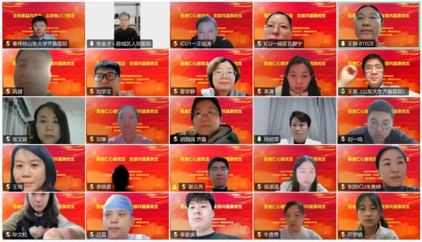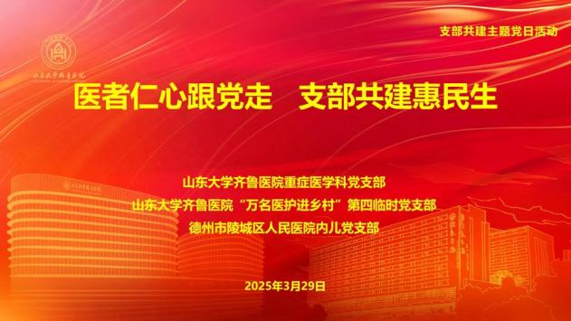 3月29日,山东大学齐鲁医院重症医学科党支部联合山东大学齐鲁医院“万名医护进乡村”第四临时党支部、德州市陵城区人民医院内儿党支部,以线上会议形式开展“医者仁心跟党走,支部共建惠民生”主题党日活动。会议由齐鲁医院重症医学科党支部书记、科主任王昊主持,近百名党员代表围绕党建共建、医疗帮扶及基层服务等议题展开深入交流,活动成效显著。