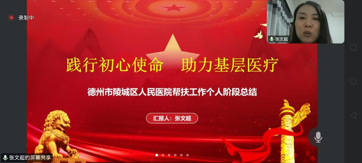 重症医学科外派代表、“万名医护进乡村”第四临时党支部书记张文超以“践行初心使命,助力基层医疗”为题,从党建融合、团队建设、帮扶成绩、社会服务等方面详细汇报了帮扶工作进展:依托齐鲁医院重症医学科“云课堂”等平台开展教学查房、技术培训及疑难病例讨论,累计惠及基层医护人员200余人次;组织多场义诊及健康宣教活动,服务群众超400人次。未来将聚焦制度建设与技术传承,推动帮扶模式从“输血”向“造血”转型。