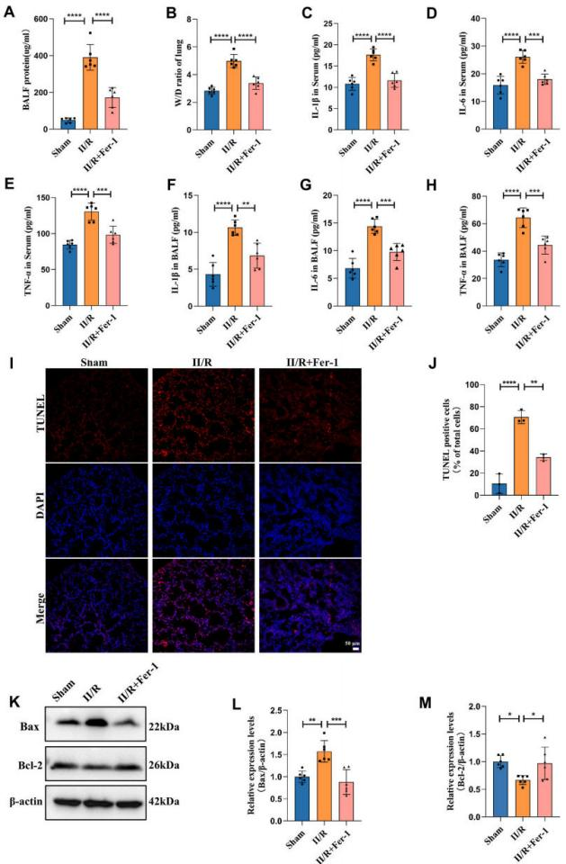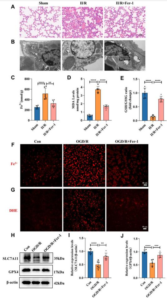 为了探究铁死亡在II/R诱导的ALI中的作用,研究团队给予铁死亡抑制剂铁抑素Fer-1进行II/R小鼠以及肺上皮细胞MLE-12氧糖剥夺再复氧(oxygen-glucose deprivation and reoxygenation, OGD/R)的干预。研究发现,Fer-1可以减轻II/R以及OGD/R诱导的ALI程度,减轻Fe2+和活性氧的蓄积,并减轻ALI后血清和肺泡灌洗液(bronchoalveolar lavage fluid,BALF)中的炎症因子水平和凋亡。