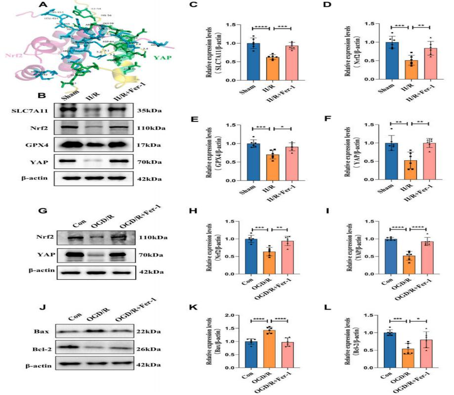 基于最新YAP同源蛋白TAZ的研究表明,在减轻炎症和增强小胶质细胞抗氧化能力方面,TAZ与Nrf2存在直接功能相互作用。因此,考虑YAP与Nrf2之间可能存在直接和间接的关联。为验证这一假设,研究人员首先对YAP和Nrf2进行了分子对接分析,发现这两种蛋白具有多个结合位点。并检测了YAP及铁死亡负调控蛋白(包括GPX4、Nrf2和SLC7A11)的表达水平。结果显示,在II/R模型中YAP、Nrf2、GPX4和SLC7A11的表达量显著降低,但经Fer-1干预后部分恢复。此外,细胞模型中Nrf2和YAP的表达水平与动物模型观察结果一致。这些结果表明,铁死亡参与了II/R诱导的II/R后ALI过程。