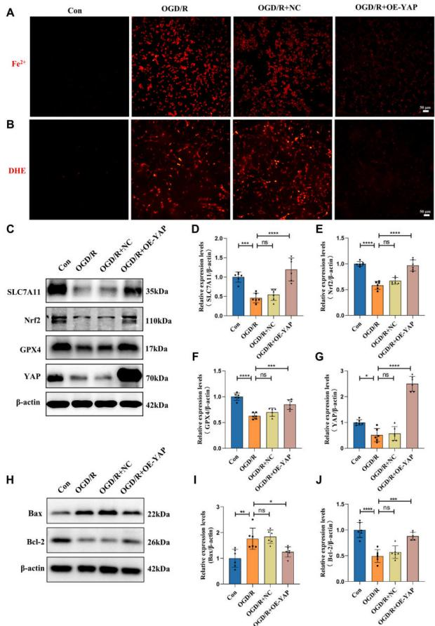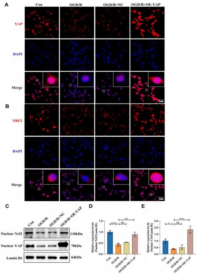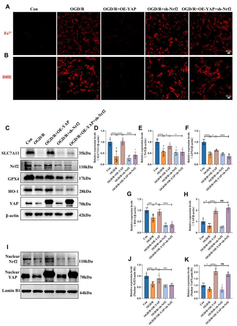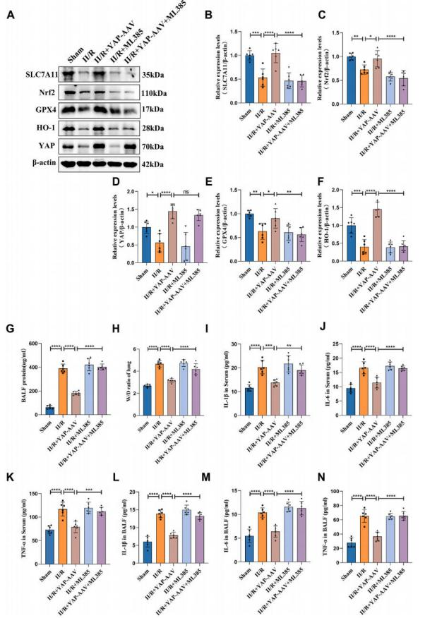 为分析YAP核蛋白特性,研究人员进行了核质分离实验,并通过蛋白质印迹和免疫荧光技术进一步研究其核定位。观察发现,YAP的过表达主要促进细胞核增殖,并推动Nrf2蛋白向细胞核转移。YAP抑制铁死亡并减轻肺损伤后炎症和凋亡。细胞模型中趋势与动物模型相一致。