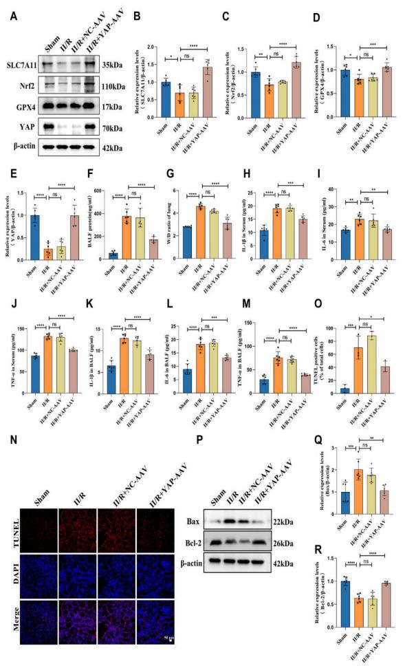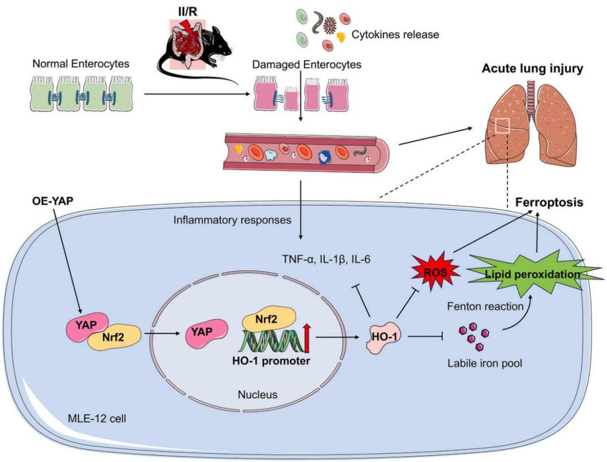 本研究结果表明,铁死亡和YAP在II/R诱导的急性肺损伤(ALI)病理生理机制中起重要作用。YAP在细胞核内表达量的增加有助于抵抗铁死亡,并通过与Nrf2结合促进其核转位来缓解ALI。