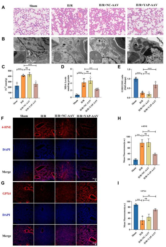 为深入阐明YAP在铁死亡及II/R诱导的ALI中的作用,本研究采用腺相关病毒(AAV)在小鼠体内过表达YAP。值得注意的是,YAP的过表达显著缓解了肺组织损伤,表现为肺出血减少和肺泡壁增厚等ALI特征性病理改变明显改善。透射电镜观察显示,YAP过表达逆转了II型肺泡上皮细胞因急性肺损伤引发的线粒体铁死亡典型改变。与II/R组相比,II/ R + YAP-AAV组的Fe2+和MDA水平显著降低,同时谷胱甘肽/还原型谷胱甘肽比值(GSH/GSSG)升高,GPX4水平下降和脂质过氧化的主要代谢产物4-羟基-2-壬烯醛(4-HNE)升高的现象。