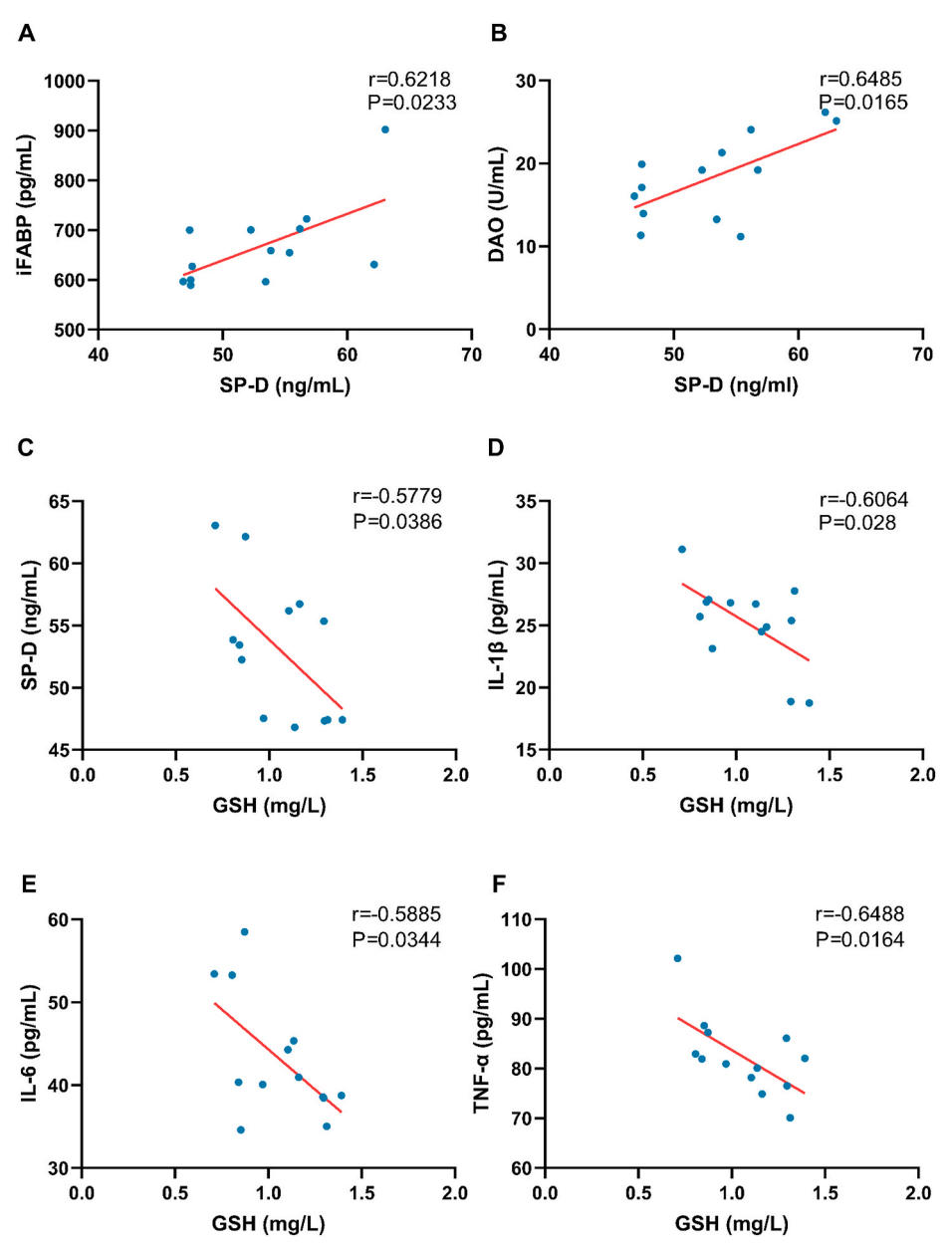 为探究接受体外循环患者的肺损伤与铁死亡之间的关联,本研究对体外循环术后6小时的患者血液样本进行线性相关性分析。结果显示SP-D与胃肠道损伤和肠屏障功能障碍的标志物:肠道脂肪酸结合蛋白(iFABP)及二胺氧化酶(DAO)呈正相关,而谷胱甘肽(GSH)则与SP-D、TNF-α、IL-6和IL-1β呈负相关。这些发现表明,体外循环诱导的肠道缺血再灌注损伤可能与铁死亡有关。