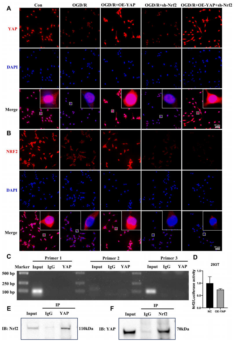YAP作为转录共激活因子,主要通过与TEAD转录因子相互作用发挥转录调控功能[30]。为探究YAP对Nrf2的潜在转录调控作用,研究团队利用JASPAR数据库预测Nrf2启动子区域内的TEAD转录因子结合位点。分析结果显示Nrf2启动子区可能存在YAP/TEAD相关结合序列:AAATTCC、TCATACCT和ACATTTCA。然而ChIP-PCR实验表明YAP并未通过TEAD与Nrf2启动子结合。为进一步验证YAP是否能转录调控Nrf2,进行荧光素酶报告实验,结果显示Nrf2启动子活性未显著增加。这些结果表明YAP并不直接转录激活Nrf2表达。随后,进一步研究了YAP是否可能通过直接相互作用在蛋白质水平调控Nrf2。共免疫沉淀(Co-IP)分析显示,YAP与Nrf2蛋白存在直接结合。因此,研究结果表明:YAP可能通过与Nrf2蛋白结合并促进其核转位来发挥抗铁死亡和肺保护作用,而非通过激活Nrf2的转录表达来调控下游靶基因。