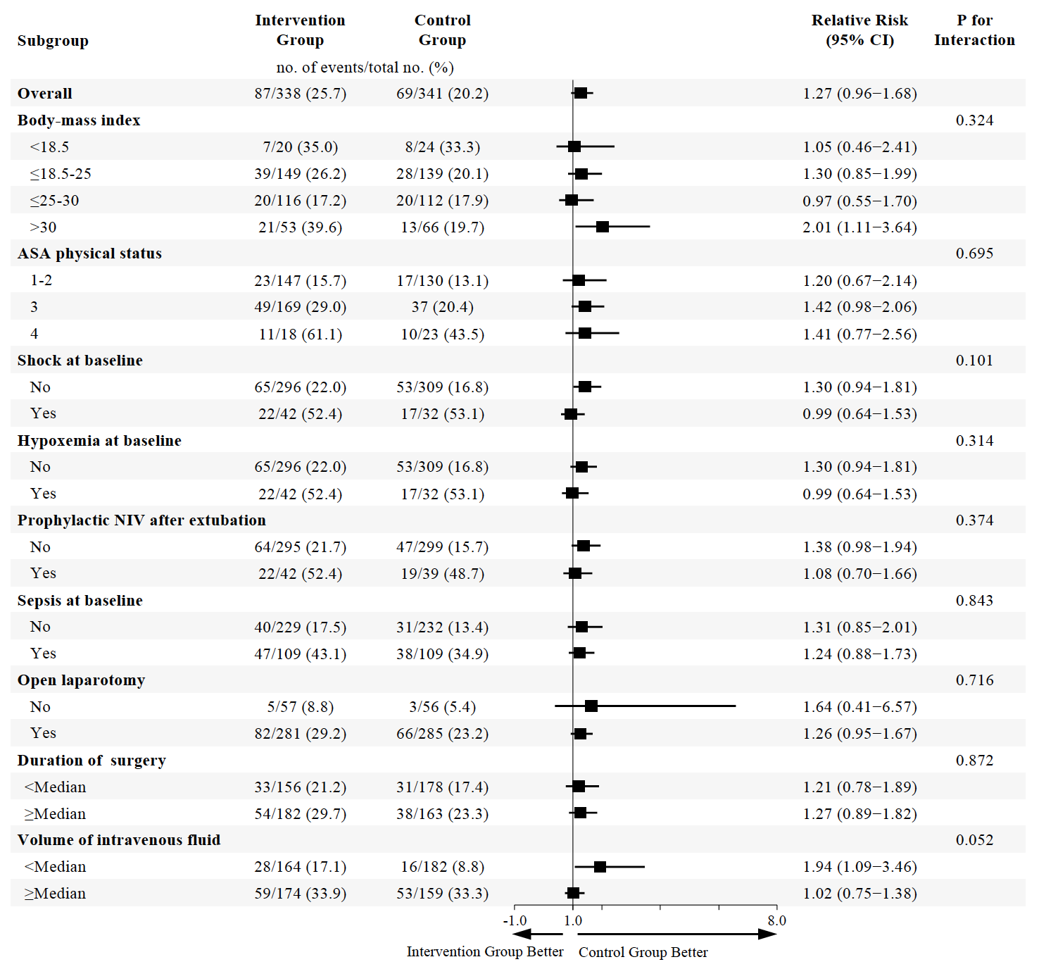 49例(14.5%)干预患者和25例(7.4%)对照患者出现了重新插管或根治性无创通气治疗急性呼吸衰竭的复合治疗(组间绝对差异,7.1%;95%CI 2.5-11.9;p = 0.004)。差异主要是由于需要治愈性无创通气的受试者数量较多(绝对差异,5.9%,95% CI 2.2-9.8;p = 0.002)。