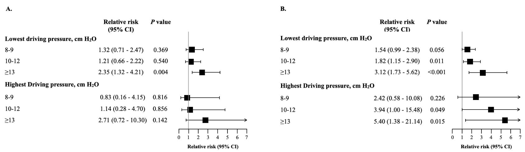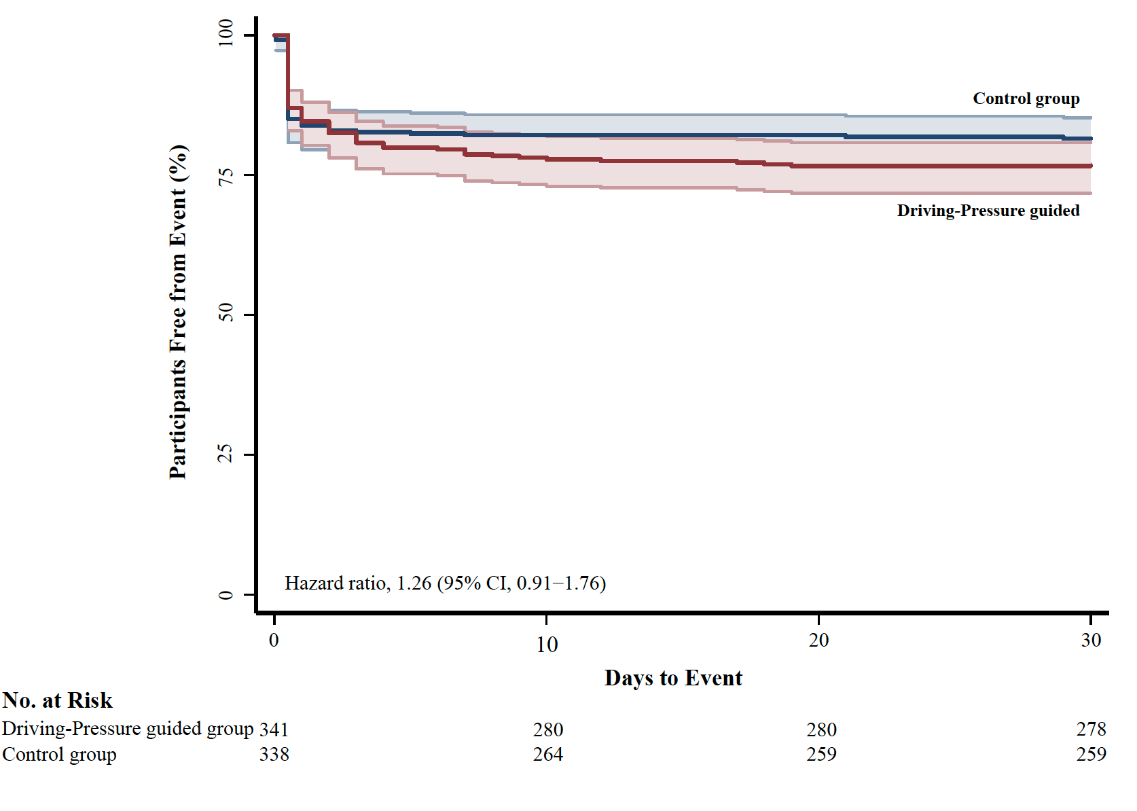 一项事后分析排除了驱动压力值超过 13 cmH2O 目标值的 94 名干预患者,结果显示干预效果没有差异(组间绝对差异,1.1%;95% CI - 5.6 至 7.8;相对风险,1.05;95% CI 0.76-1.45;P = 0.751)。探索干预效果大小是否随驱动压力组别而变化的事后分析显示,主要结果存在显著差异。