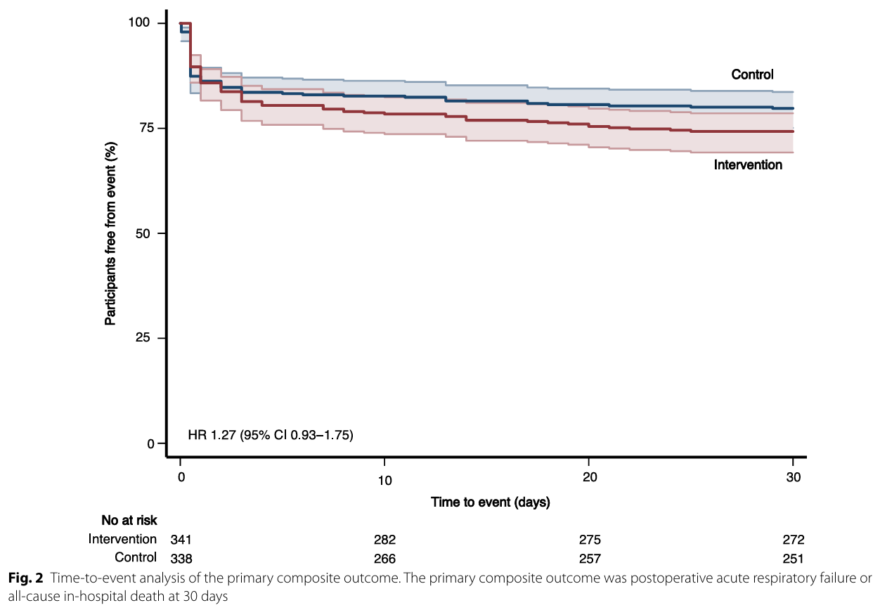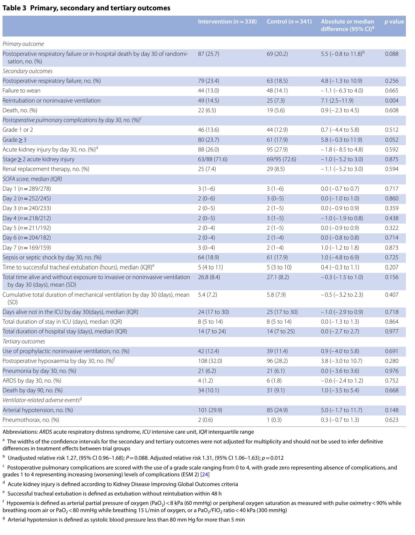 次要结局:术后肺部并发症分级(1-4级);机械通气至第一次气管拔管的持续时间;成功气管拔管的总时间;第 30 天存活且无机械通气的天数;第 30 天机械通气的累计总持续时间;第 7 天的器官衰竭序贯器官衰竭评估 (SOFA) 的评分测量,通过排除格拉斯哥昏迷量表进行修改;第30天急性肾损伤;第 30 天败血症或感染性休克;ICU内和住院时间。