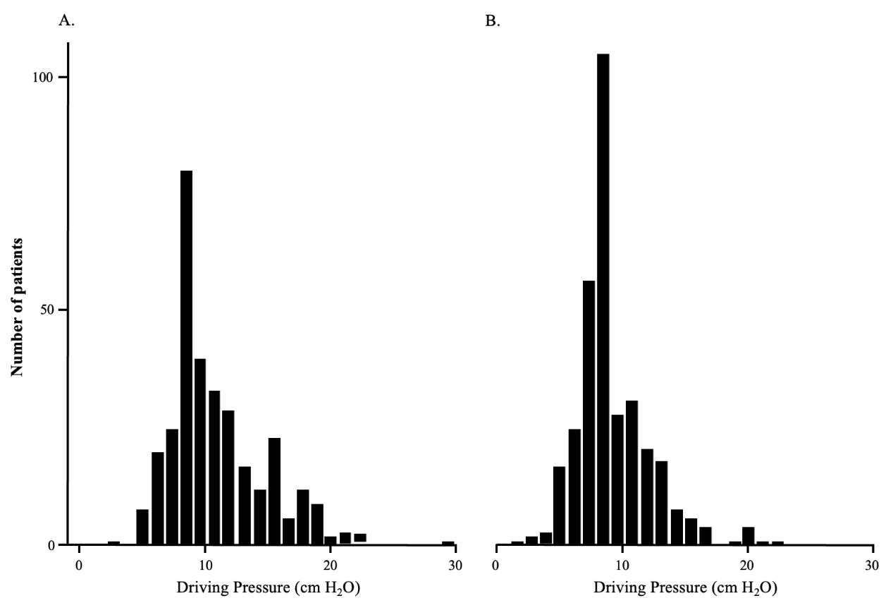 对照组(A)和干预组(B)初始设置呼吸机后的驱动压力分布