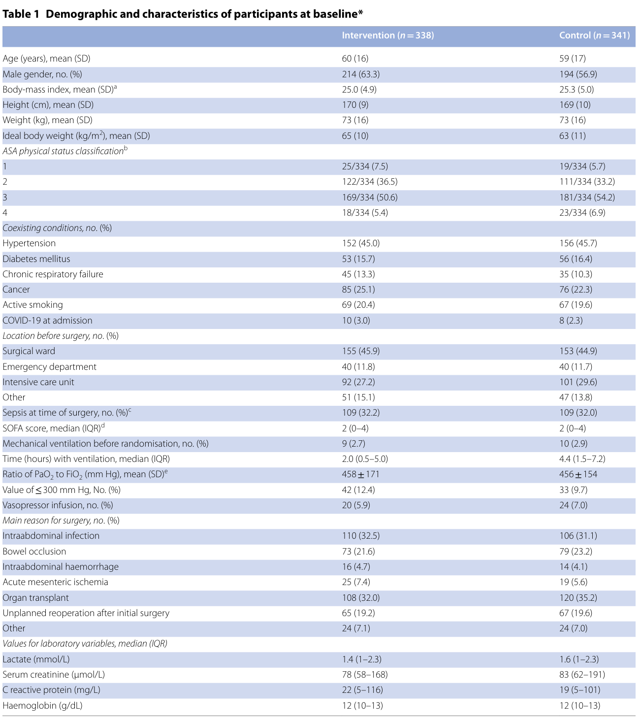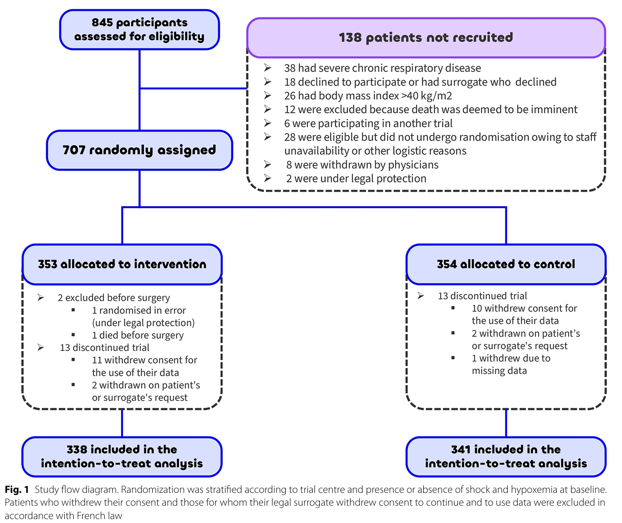 参与者在到达手术室后由主治麻醉师以 1:1 的比例随机分配。根据部位、是否存在休克(定义为持续静脉输注血管活性药物)和低氧血症(动脉血压分压/吸入氧分数(PaO2/FiO2) 比率 ≤ 300)。患者、试验人员、收集和评估临床结局的研究人员以及统计学家不知道研究组的分配。