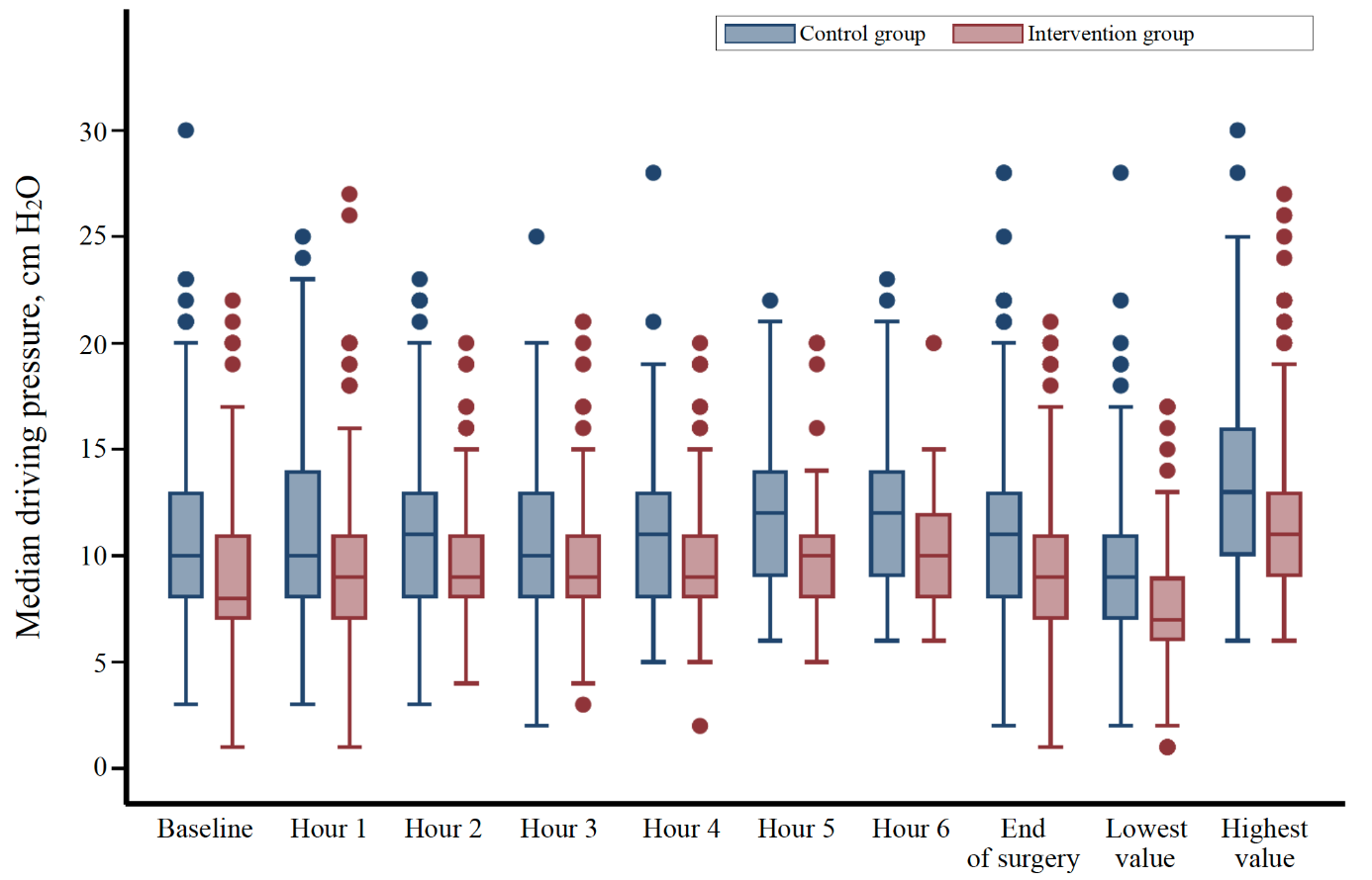 在手术过程中,干预组患者的驱动压力值低于对照组患者,而平台压高于对照组患者。在干预组中,94 名患者(27.9%)的驱动压力值超过了 13 cmH2O 的目标值。干预组中有 3.9% 的患者因持续低氧血症使用了抢救疗法,而对照组中只有 8.8% 的患者使用了这种疗法。静脉输液量中位数和血液动力学变量在组间没有差异。
