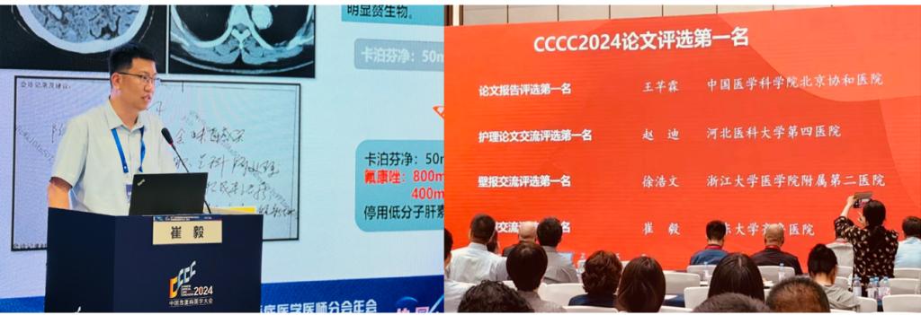 在病例比赛环节中,重症医学科崔毅汇报了题为“防患于未然,扼难于未发——累及颅内、眼内的播散性葡萄牙念珠菌1例”的救治过程。他以扎实的专业知识、成熟的临床思维和生动的舞台表现,赢得了评委的高度评价。最终在众多优秀的参评选手中脱颖而出,荣获此次全国大会病例交流第1名的佳绩。