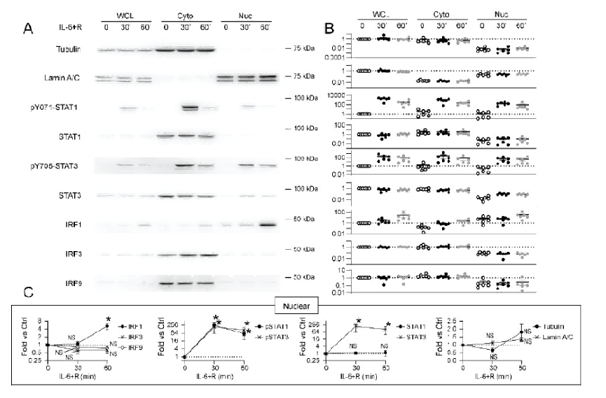 IL - 6刺激能够诱导STAT1的磷酸化和核转位,同时影响IRF1等干扰素调节因子在细胞核中的表达,暗示IL - 6信号通路与免疫和炎症反应相关基因的转录调控存在关联。而STAT3以及其他IRF(如IRF3、IRF9)在该实验条件下的变化不明显