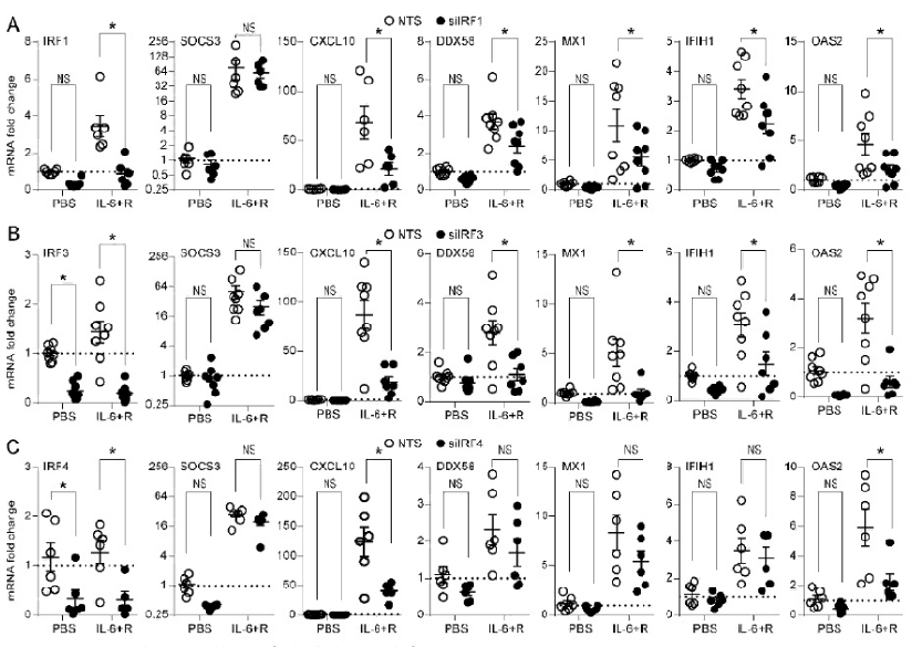 IL - 6+R处理能够影响多种基因(包括IRF1、IRF3、IRF4、CXCL10、DDX58、MX1、IFI1H、OAS2等)的mRNA表达水平,并且干扰IRF1、IRF3、IRF4基因后,这种影响可能会发生改变。而SOCS3基因的表达似乎不受IL - 6+R处理以及IRF基因干扰的显著影响