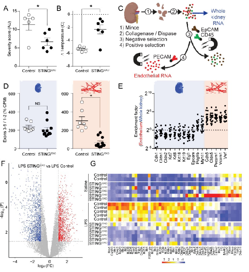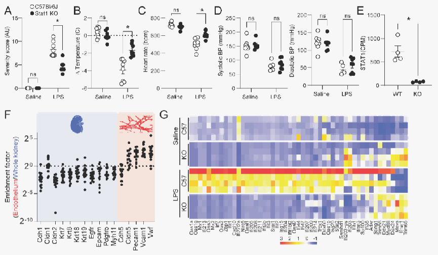 内皮STING或STAT1缺失减轻LPS攻击严重程度,降低内皮ISG表达。