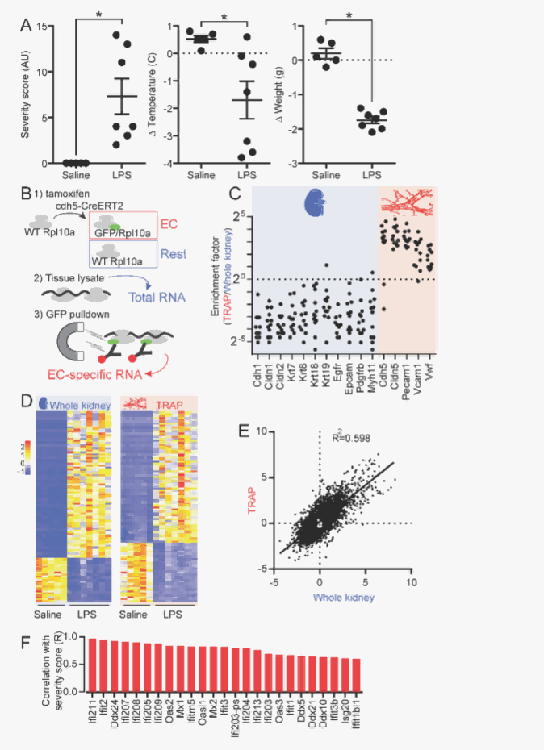 急性内毒素血症使肾内皮细胞强烈表达ISG,内皮SOCS3缺失增强ISG表达。 LPS能够诱导小鼠产生炎症反应,引起严重程度增加、体温降低和体重减轻等生理变化。揭示了肾脏组织中不同基因在TRAP和全肾中的富集差异,以及LPS处理对全肾和TRAP中基因表达的影响。发现全肾和TRAP中的基因表达存在一定相关性,同时筛选出了与炎症严重程度相关的基因,为后续研究炎症机制提供了基因层面的线索。