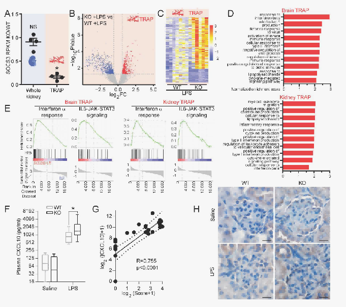 该图表整体呈现了SOCS3基因敲除(KO)小鼠在脂多糖(LPS)刺激下,与野生型(WT)小鼠相比,在肾和脑的特定组分(TRAP)中基因表达、免疫反应和信号通路的变化情况,以及血浆中细胞因子(如CXCL10)的浓度变化和肾组织的病理变化,突出了SOCS3在调节免疫反应和相关信号通路中的重要作用