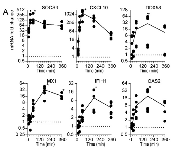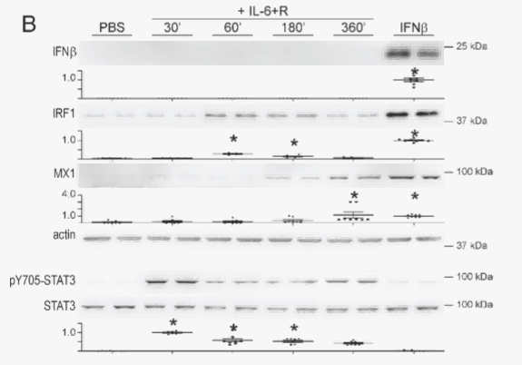 图表A展示了在特定实验条件下,多个基因(SOCS3、CXCL10等)的mRNA表达水平随时间的动态变化,表明这些基因在不同时间点的表达调控情况。图表B检测了不同处理组(PBS、IL - 6 + R、IFNβ)下相关蛋白(IFNβ、IRF1等)的表达情况,该图表反映了IL - 6 + R和IFNβ处理对相关基因转录和蛋白表达的调控作用。