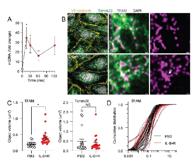 IL - 6 + R处理可以影响细胞中线粒体相关指标、可引起mtDNA含量在不同时间点的动态变化、影响TFAM在线粒体上的分布和其对象体积,而对线粒体膜蛋白Tomm20的对象体积无显著影响。这些结果可能暗示IL - 6 + R处理通过影响TFAM与线粒体的关联,进而影响线粒体的功能或状态。