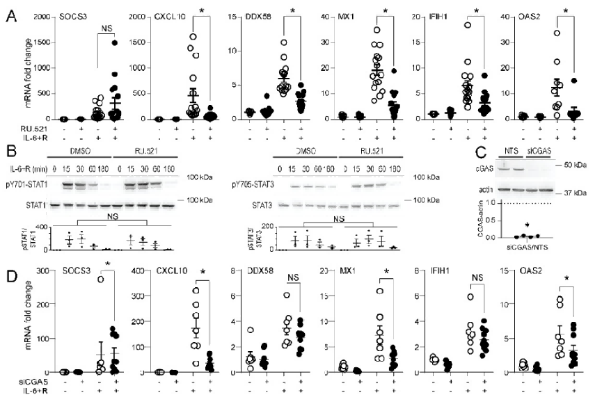 RU.521对IL - 6 + R诱导的部分基因(如CXCL10等)的mRNA表达有显著影响,可能起到增强作用,但对STAT1和STAT3的磷酸化水平影响不显著。siCGAS处理显著降低了cGAS蛋白的表达水平,并且对IL - 6 + R诱导的部分基因(如SOCS3等)的mRNA表达也有显著影响,表明cGAS可能参与了IL - 6 + R相关的基因表达调控过程。 这些结果为进一步研究细胞信号通路和基因表达调控机制提供了数据支持。