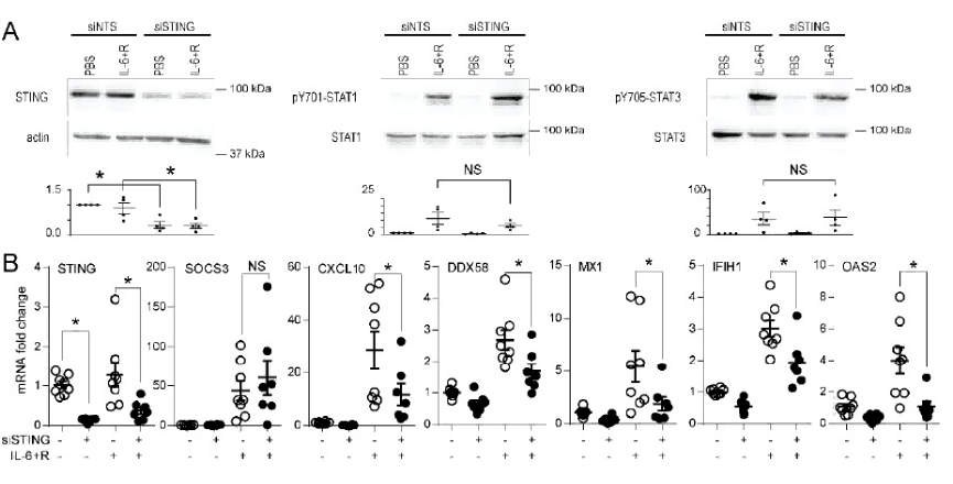 敲低STING(siSTING处理)能够显著降低STING蛋白和相关基因(如CXCL10、DDX58、MX1、IFI1H1、OAS2等)的mRNA表达水平,而对STAT1和STAT3的磷酸化水平没有显著影响。这暗示STING在调控这些基因表达中发挥重要作用,可能参与相关的免疫或炎症信号通路,但对STAT1和STAT3的磷酸化调控影响较小。