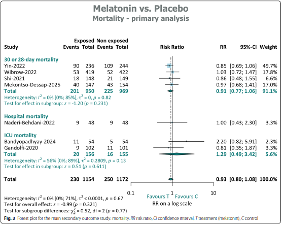 研究结果:褪黑素对28天或30天死亡率无显著影响(RR 0.91 [95% CI 0.77-1.06], I2 = 0% [95% CI 0-85%], p = 0.23)。