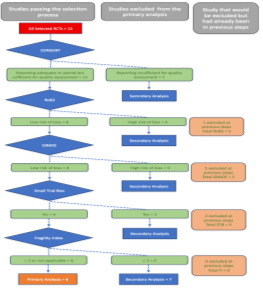3.5 主要分析&次要分析:对于主要结局(谵妄发生率)和主要次要结局(死亡率),预先定义了两个分析层次。主要分析包括采用稳健方法学的研究,遵循风险偏倚评估结果。次要分析包括所有符合条件的研究,不考虑方法学的局限性。