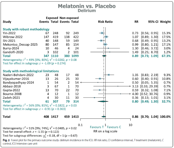 研究结果:褪黑素对谵妄发生率没有影响。主要分析和次要分析结果一致,相对危险度(RR)分别为0.89 [95%CI: 0.73-1.09]和0.86 [95%CI: 0.70-1.04]。
