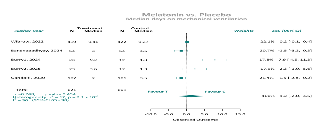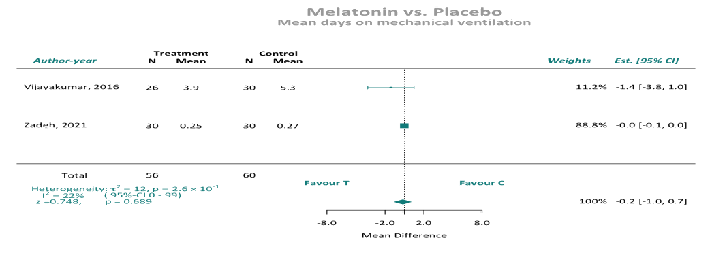 机械通气时间:6项随机对照试验报告了机械通气持续时间的数据(n = 1338例患者;褪黑激素组677例,对照组661例)。汇总分析显示,当汇总报告的平均值或中位数数据时,通气时间和褪黑素给药之间没有关联。