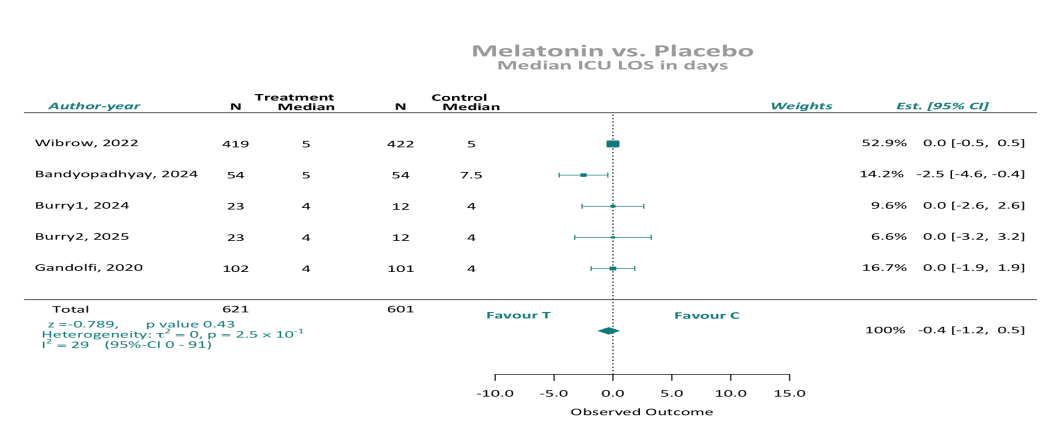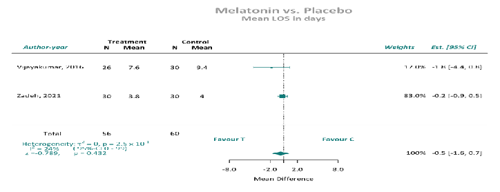 住院时间:9项随机对照试验(n = 1338例患者;褪黑素组677例,对照组661例)报告了ICU住院时间。汇总分析显示,当汇总作者报告的平均值或中位数数据时,褪黑激素和安慰剂之间没有显著差异。