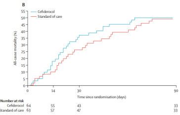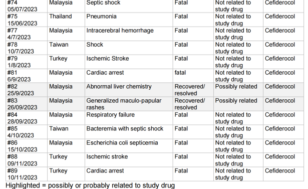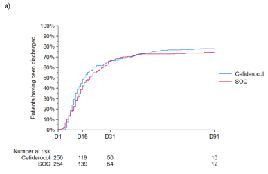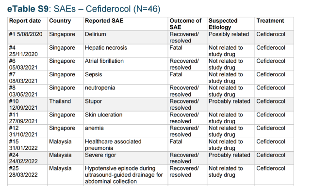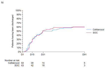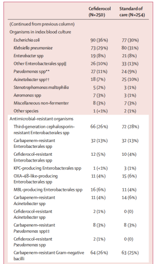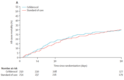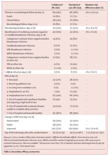 至第 30 天时,头孢地尔组 250 名患者中有 42 名(17%)已死亡,而标准治疗组 254 名患者中有 38 名(15%)已死亡(绝对风险差异 2%[95%CI -5 至 8])。至第 90 天时,头孢地尔组 250 名患者中有 73 名(29%)已死亡,而标准治疗组 254 名患者中有 75 名(30%)已死亡(绝对风险差异 0%[-8 至 8];表2)。截至第 14 天出现临床或微生物学失败的患者比例、第 3 至 90 天出现微生物学失败的比例、第3 至 90 天出现多重耐药菌定植或感染或念珠菌血流感染的比例、以及第 3 至 90 天出现艰难梭菌感染的比例,在头孢地尔组和标准治疗组之间均相似(表3)。第 30 天的功能状态(表 3)以及存活出院患者的住院时间在治疗组间也相似。