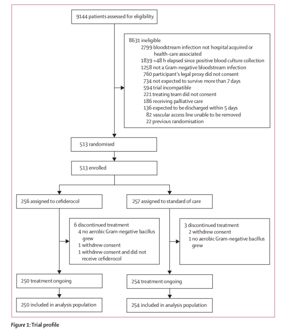 本研究受试者于 2019 年 11 月 12 日至 2023 年 10 月 31 日期间完成入组。研究期间共筛查了 9144 名患者,其中 513 名被随机分配接受治疗;然而,有 9 名受试者因撤回知情同意或未培养出需氧革兰氏阴性杆菌而被排除在进一步分析之外(图 1)。因此,主要分析人群共包含 504 名受试者(250 名接受头孢地尔治疗,254 名接受标准治疗)。