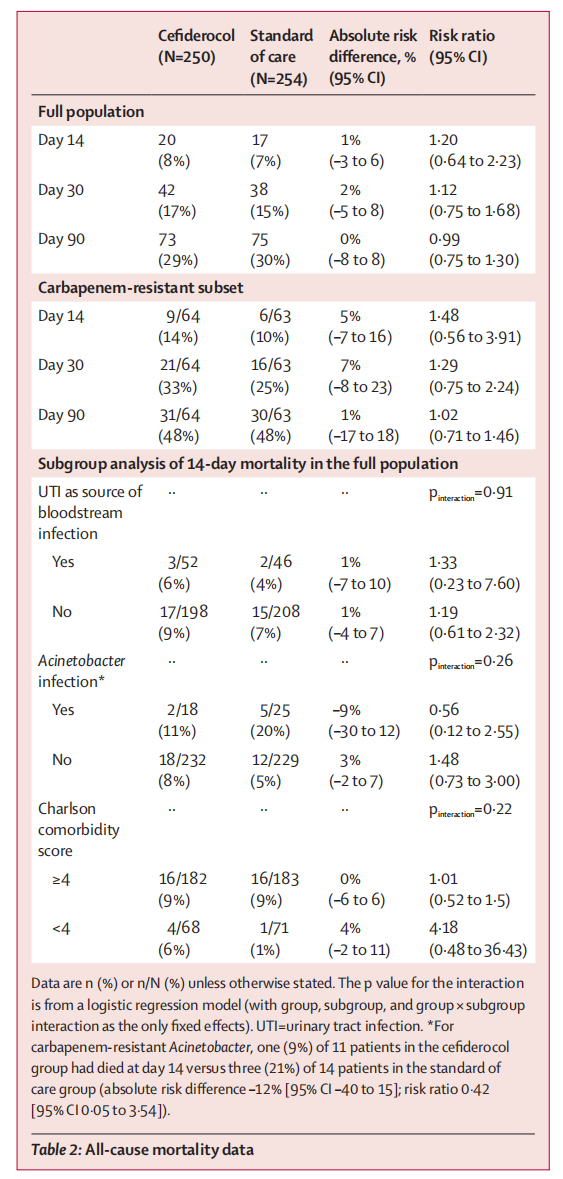 在头孢地尔组 250 名患者中,20 名(8%)在 14天时已死亡,与之相比,在标准治疗组 254 名患者中,17 名(7%)已死亡(绝对风险差异 1%,[95%置信区间-3 至 6]),显示了非劣效性。在耐碳青霉烯类亚组内,头孢地尔组 64 名患者中,9名(14%)在 14 天内已死亡,与之相比,标准治疗组63 名患者中,6 名(10%)已死亡(绝对风险差异 5%,[-7 至 16])。头孢地尔的优效性未在主要分析人群或碳青霉烯耐药亚组中显示。并且没有充分的证据来拒绝关于头孢地尔在碳青霉烯耐药亚组中存在劣效性的零假设。