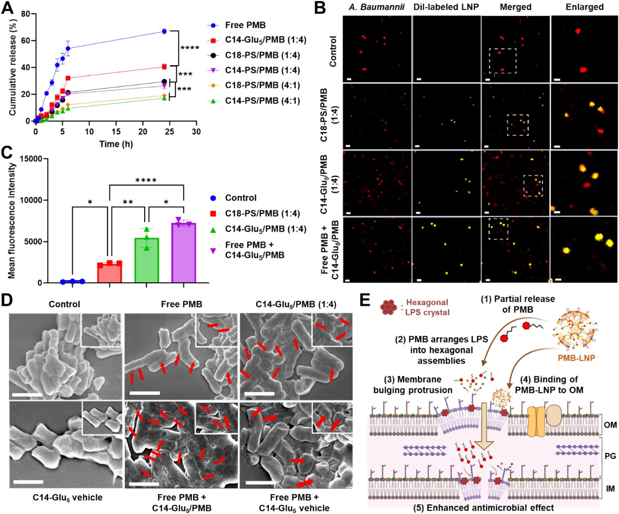 为了解C14-Glu5/PMB (1:4) LNP增强抗菌效果的机制,我们评估了优化的PMB-LNPs在 37℃下PBS (pH 7.4) 中的PMB释放动力学。 游离PMB迅速从透析盒中扩散出来,24小时后累积释放达到约67%(图3A)。 C14-Glu5/PMB (1:4) LNPs表现出显著 $(p<0.0001)$ 更慢的药物释放,这可能是由于包裹的PMB分子从LNP内部扩散延迟所致。 有趣的是,PMB的释放高度依赖于所掺入的阴离子脂质及其电荷比。 例如,在电荷比为4:1时形成的PMB-LNPs,如C14-PS/PMB (4:1) 和C18-PS/PMB (4:1),显示出比电荷比为1:4时形成的PMB-LNPs更持续的PMB释放。 电荷比为4:1时PBM释放较慢的原因,可能是阳离子PMB与大量存在的阴离子脂质之间更强的静电相互作用所致。