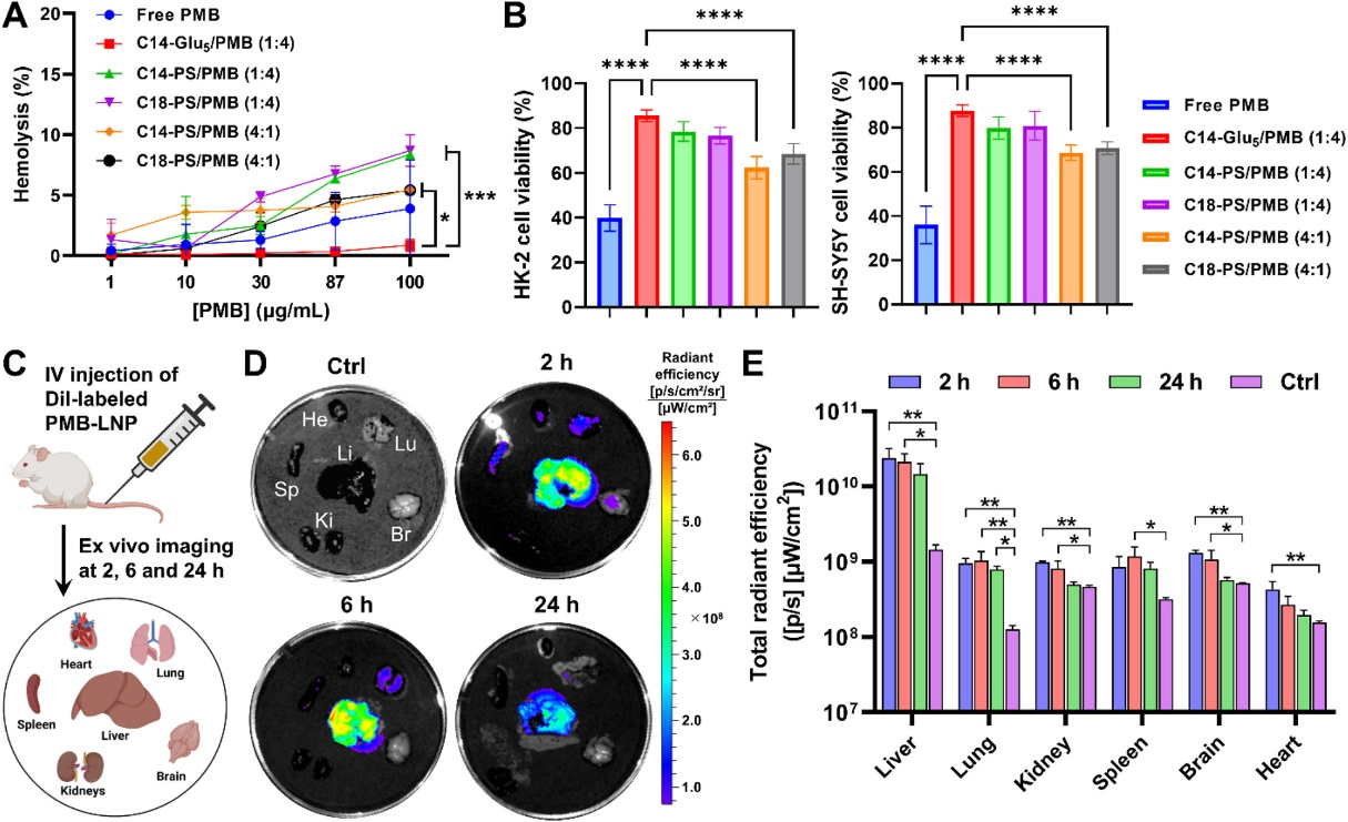 先前报道的临床研究表明,高剂量PMB单一疗法可通过PMB在肾脏和大脑中的主要蓄积以及随后在这些器官中断言细胞毒性作用而引起急性肾毒性和神经毒性 [7-10, 662]。 从这个角度出发,我们评估了PMB-LNPs对人近端肾小管上皮细胞系HK-2和人神经母细胞瘤细胞系SH-SY5Y的细胞相容性。游离PMB具有高毒性,在处理24小时内导致约60%的HK-2和SH-SY5Y细胞死亡(图4B)。 相反,用等剂量 300ug/mL的C14-Glu5/PMB (1:4) LNPs处理的细胞,观察到超过85%的细胞活力,表明其具有优越的细胞相容性。 有趣的是,在电荷比为1:4时形成的PMB-LNPs,如C14-PS/PMB (1:4) 和C18-PS/PMB (1:4),其细胞毒性低于电荷比为4:1时形成的PMB-LNPs。