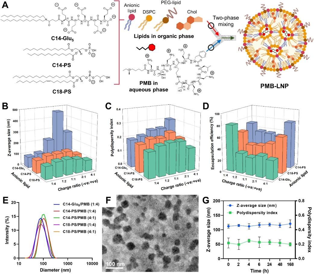 借鉴核酸LNP体系的电荷匹配设计理念,反向采用阴离子脂质来负载阳离子药物(PMB),实现电荷自组装。