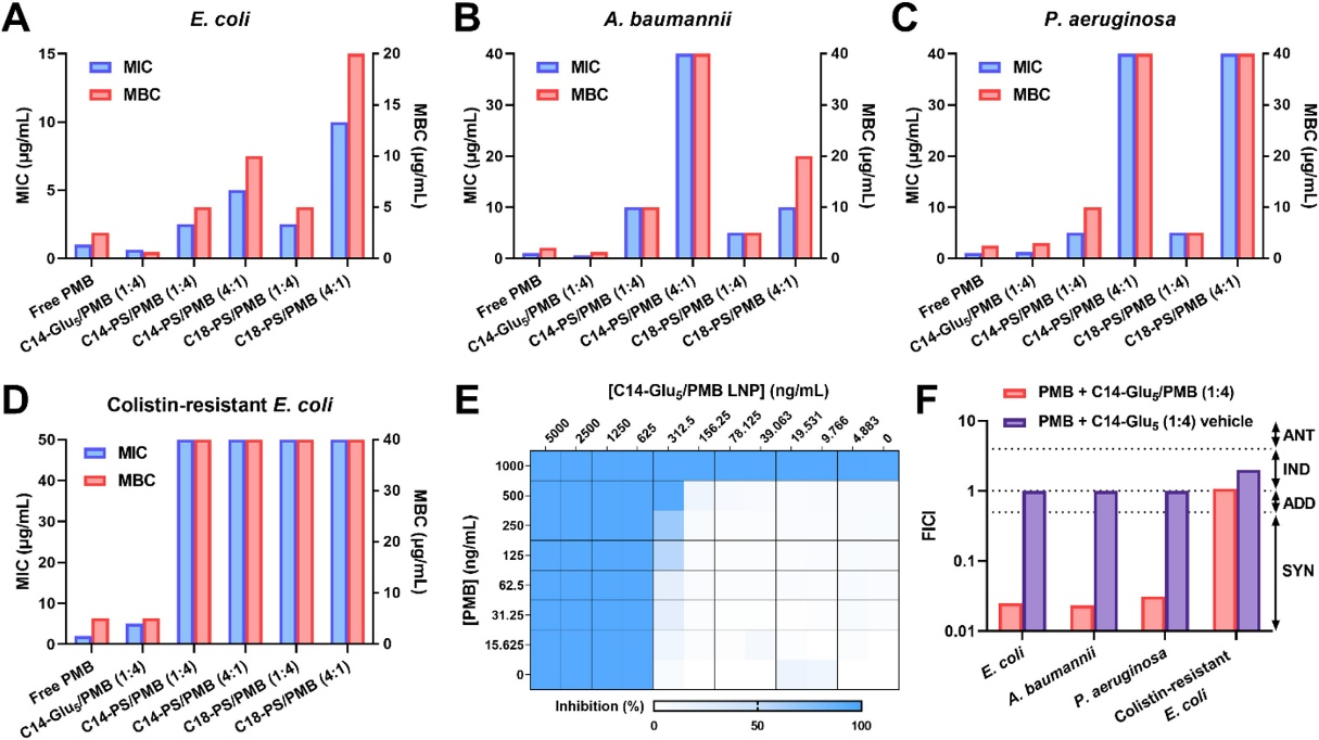 我们通过测定优化的PMB-LNP制剂对4种不同革兰氏阴性菌(大肠杆菌、鲍曼不动杆菌、铜绿假单胞菌和耐粘菌素大肠杆菌)的最低抑菌浓度(MIC)和最低杀菌浓度(MBC)来考察它们的抗菌性能。 在PMB-LNP制剂中,C14-Glu5/PMB (1:4) LNPs对所有测试细菌均表现出最强的抗菌活性,其MIC和MBC值最低(图2A-D)。 有趣的是,在电荷比为1:4时形成的PMB-LNPs,如C14-PS/PMB (1:4) 和C18-PS/PMB (1:4),在根除大肠杆菌、鲍曼不动杆菌和铜绿假单胞菌方面,比较电荷比为4:1时形成的PMB-LNPs更有效。 值得注意的是,在测试的制剂中,只有游离PMB和C14-Glu5/PMB (1:4) LNPs能有效抑制耐粘菌素大肠杆菌的生长(图2D)。 为研究游离PMB与C14-Glu5/PMB (1:4) LNPs之间的潜在协同作用,我们对所有革兰氏阴性菌进行了微量稀释棋盘法测定(图2E和S10)。 随后计算了协同抑制浓度指数(FICI)以确定协同作用的水平(表S4)。游离PMB和C14-Glu5/PMB (1:4) LNPs的组合对大肠杆菌、鲍曼不动杆菌和铜绿假单胞菌具有协同杀菌作用。 相比之下,游离PMB和C14-Glu5 (1:4) 载体组合则检测为无关作用(图2F)。 不出所料,耐粘菌素大肠杆菌对PMB治疗的敏感性较低,FICI值急剧增加证明了这一点。 这些结果表明,从C14-Glu5/PMB (1:4) LNPs释放的游离PMB分子与C14-Glu5/PMB (1:4) LNPs之间的协同效应可能至少部分促成了它们更优的抗菌效力。