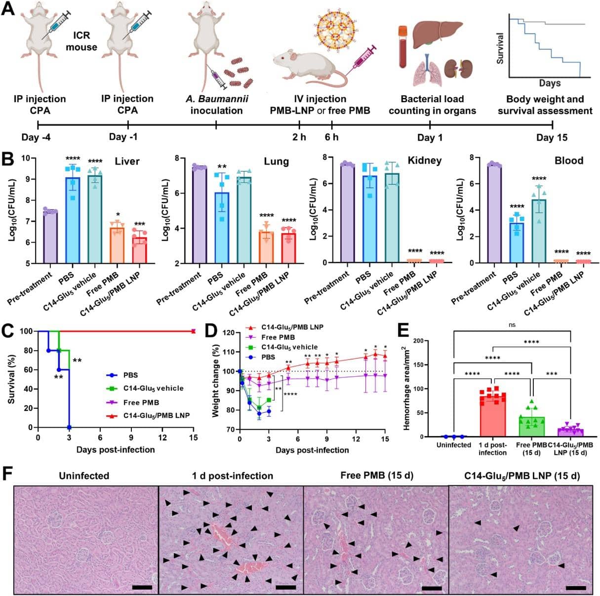 重要的是,在15天终点时,用C14-Glu5/PMB LNPs治疗的小鼠的肾小管间出血程度显著 $(p<0.001)$ 低于用游离PMB治疗的小鼠。 考虑到游离PMB和C14-Glu5/PMB LNP均在很大程度上将肾脏中的细菌负荷减少到几乎检测不到的水平(图5B),肾脏出血很可能是由在抗生素治疗中存活下来的残留细菌再生长引起的。 因此,我们可以从我们的观察中推断,C14-Glu5/PMB LNP在抑制鲍曼不动杆菌在肾脏中再生长方面,其效果比游离PMB更持久。 基于药代动力学数据(图S14),C14-Glu5/PMB LNPs的延长功效可能源于其延长的全身循环。 用游离PMB或C14-Glu5/PMB LNPs治疗后,血清肌酐水平(一个众所周知的肾功能标志物 [61])显著降低,进一步证实了这一发现(图S15A)。 在15天终点时,游离PMB和C14-Glu5/PMB LNPs治疗组的血清肌酐水平与未感染组相似 $(p>0.05)$。 此外,发现C14-Glu5/PMB LNP和游离PMB治疗能将血清丙氨酸转氨酶(ALT,一种肝功能标志物)水平恢复到正常水平(图S15B)。 与临床化学结果一致,肝脏和肺的组织学分析显示,在终点时没有与细菌感染相关的组织异常(图S16)。