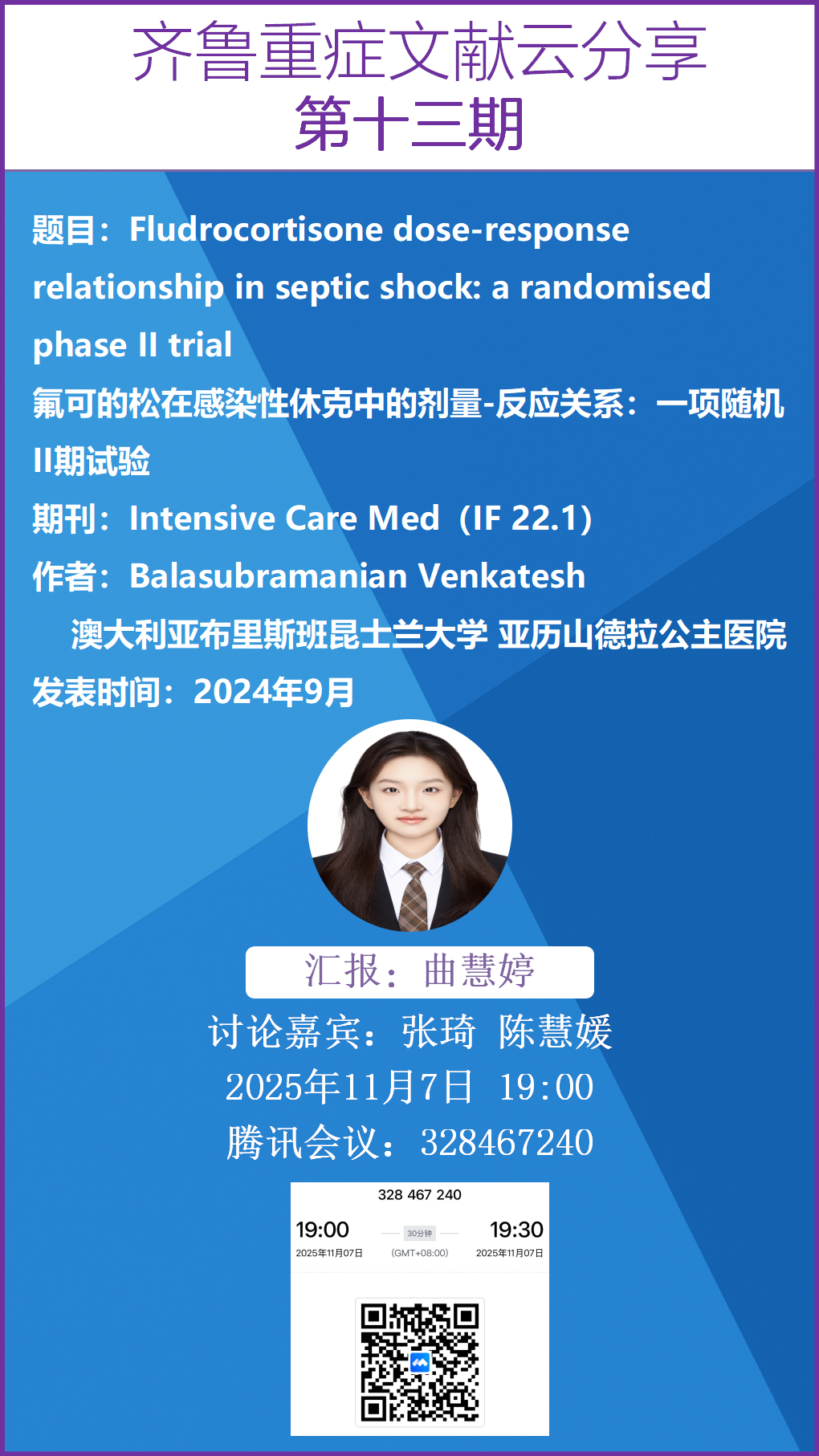 齐鲁重症文献云分享 第十三期丨氟可的松在感染性休克中的剂量-反应关系:一项随机II期试验