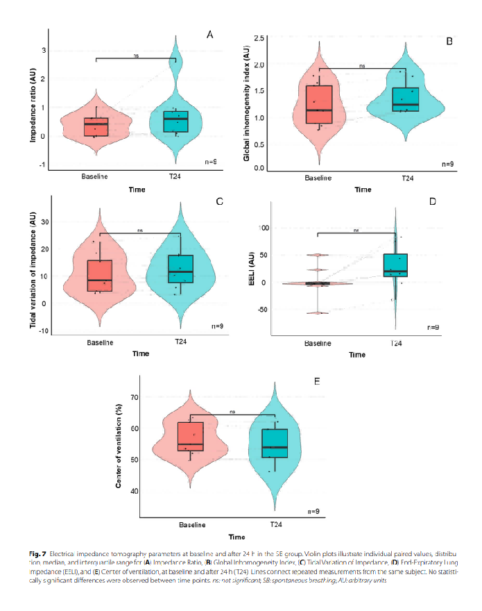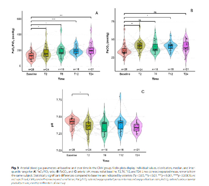 在基线时(自主呼吸期间),测量了生命体征、动脉血气、电阻抗断层扫描(EIT)数据以及促炎细胞因⼦的血浆样本。对于自主呼吸患者(SB组),为了提⾼患者舒适度,在入组后24小时(T24)采集了相同的数据。在CMV组中,还采集了额外的中间时间点数据。