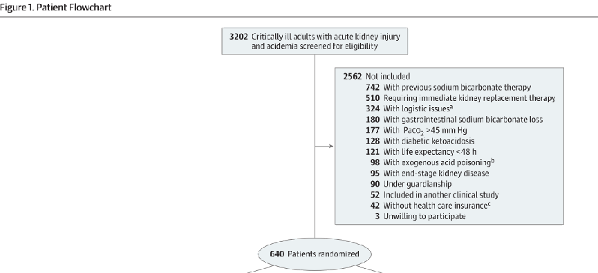 研究共筛查了 3202名 符合“危重成人、急性肾损伤伴酸中毒”基本特征的患者,其中 2562名患者因不符合具体入排标准被排除。共纳入640名患者随机分为两组(每组320人)。
