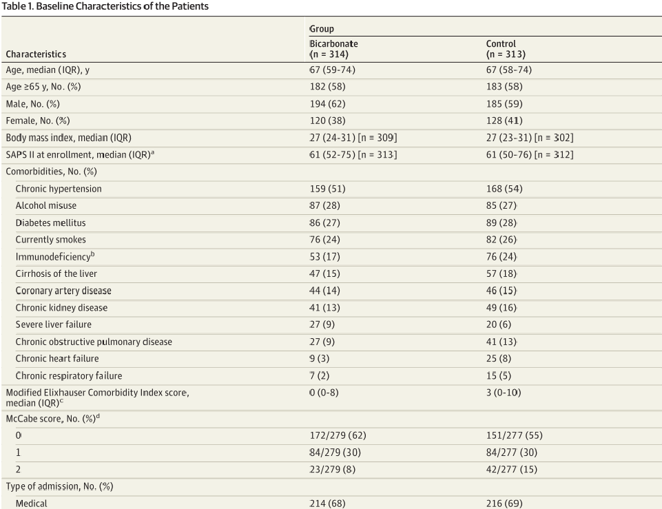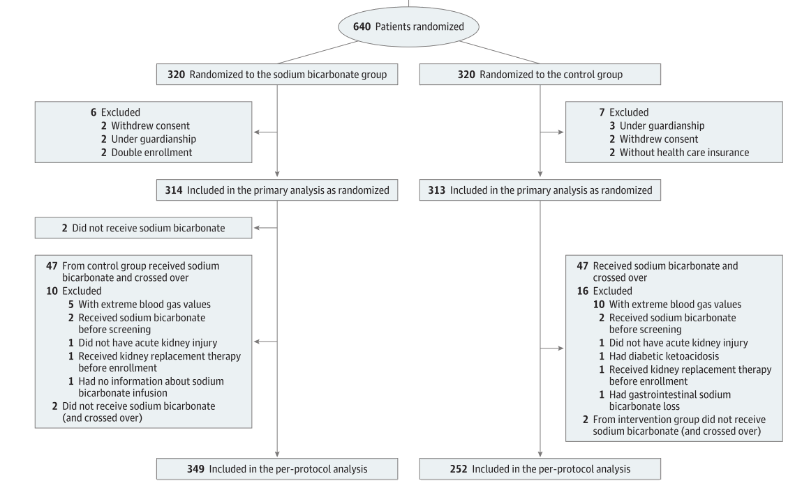 按随机分组进行统计分析:碳酸氢钠组入组320名患者中,排除6名(2名撤销同意、2名缺乏法律规定的民事行为能力、2名重复入组)最终314名进入主要分析;对照组入组320名患者中,排除7名(3名缺乏法律规定的民事行为能力、2名撤销同意、2名无医保)最终313名进入主要分析。最终,主要分析集(意向性分析集)共包含 627 名患者。