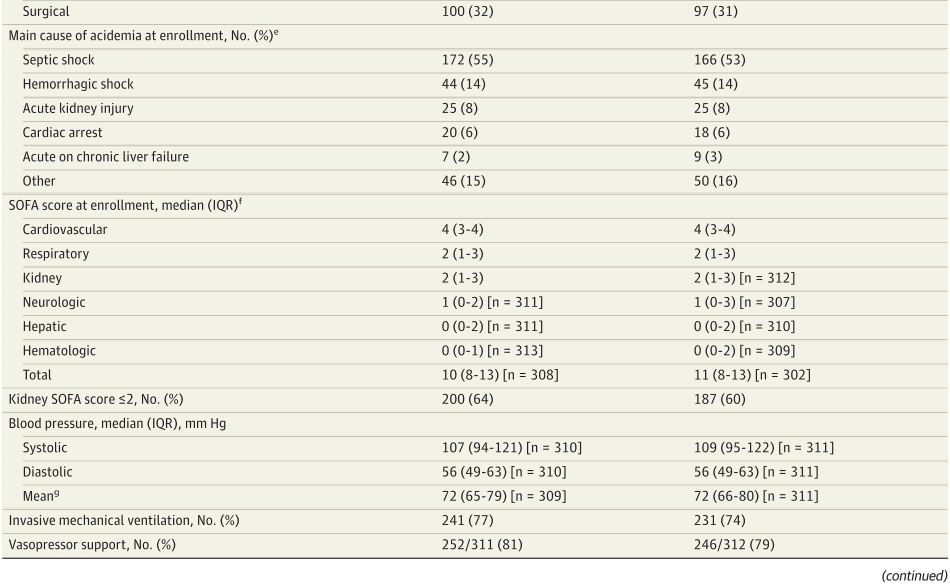 方法:本研究为多中心RCT研究,纳入640例pH ≤ 7.20,合并KDIGO标准2–3期急性肾损伤的ICU患者,以1:1的比例随机分配入两组,碳酸氢钠组输注4.2%碳酸氢钠至pH ≥ 7.30,对照组不输注,对纳入患者进行90天随访。主要结局为90天全因死亡率。次要结局包括第28天和第180天全因死亡率;器官支持治疗、升压药或有创机械通气的使用;ICU住院天数和总住院天数;ICU获得性感染;液体平衡;第7天SOFA评分,以及第90天的严重肾功能不全。