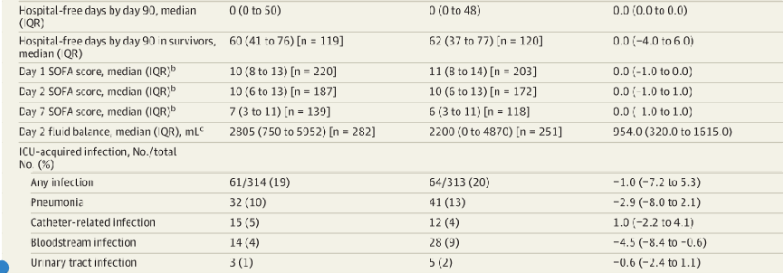 次要结局:第28、180天死亡率;KRT、升压药、机械通气使用;ICU及总住院时长;液体平衡、第7天SOFA评分、ICU获得性感染、第90天的严重肾功能不全事件。