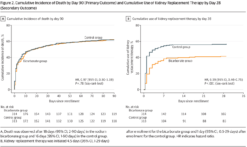 次要结局:这项研究中肾脏替代治疗相关指标在两组间存在显著差异。第28天时,碳酸氢钠组有35% 的患者接受了肾脏替代治疗,而对照组高达50%,两组之间差异具有统计学意义,且碳酸氢钠组启动治疗的中位时间也显著延迟。这强烈提示,碳酸氢钠治疗可以显著减少患者对KRT的需求,并可能将其启动时间推迟。