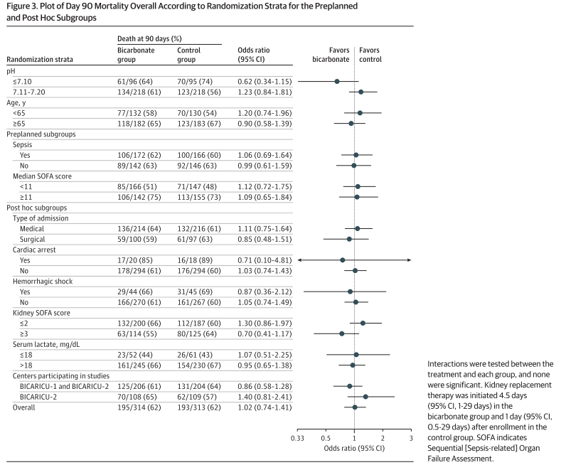 系统性地展示了在第90天死亡率这一主要结局上,各个预设和事后亚组的分析结果。每一条亚组的横向置信区间,都与总体结果的区间一样,横跨了无效线。研究没有发现任何可靠的证据能够支持碳酸氢钠在前文提到的特定亚组患者中具有生存获益。