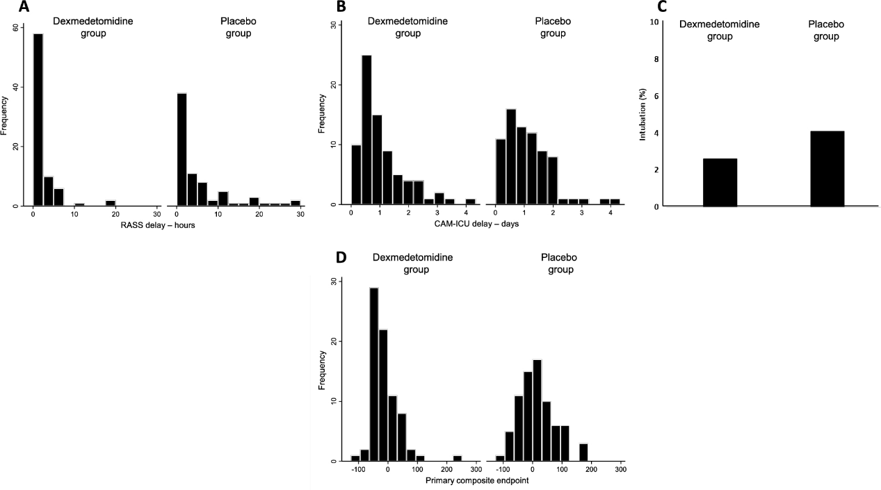 主要复合终点(躁动持续时间(小时,定义为RASS≥+1)、谵妄持续时间(天,定义为达到CAM-ICU阴性评分的时间)或插管(深镇静和机械通气)的复合评分,绝对值越大效果越差):右美托咪定优于安慰剂,差异显著。