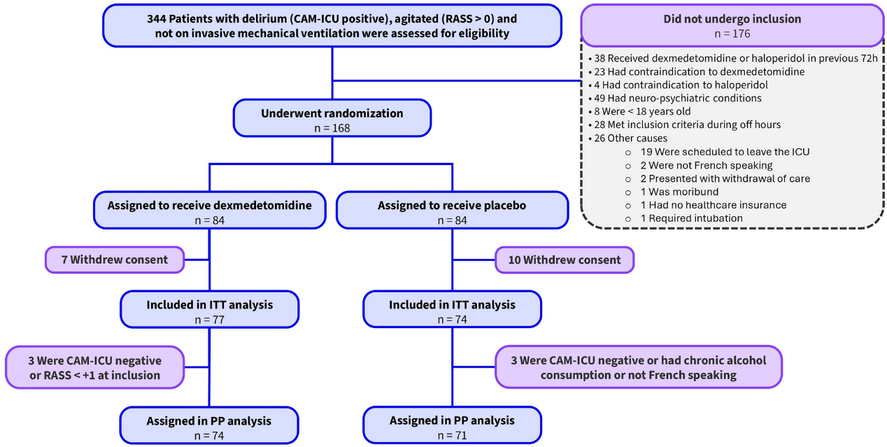 对因急性病症入住重症监护室(ICU)且未插管的躁动性谵妄成人患者进行筛选。 根据法国法律规定,随机分组后共有17名患者退出研究:部分因代理决策者撤回同意,部分在恢复决策能力后主动退出(即使已接受研究药物)。另有4名参与者不符合纳入标准,2名出现排除标准,故未纳入方案分析。 主要结局数据无缺失,但5例患者(地西泮组3例,安慰剂组2例)的30天存活状态数据缺失。